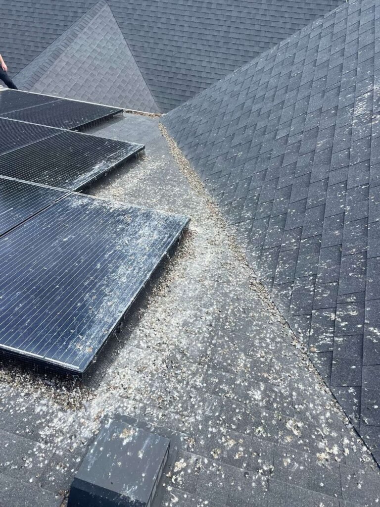 Pigeon droppings are highly acidic. Over time, this acidity eats away at shingles, skylight flashing, gutters, panel mounting hardware, and metal roof features. Nesting materials also trap moisture, increasing the likelihood of wood rot and leaks. A seemingly small nest under one panel can eventually compromise the roof structure beneath it.